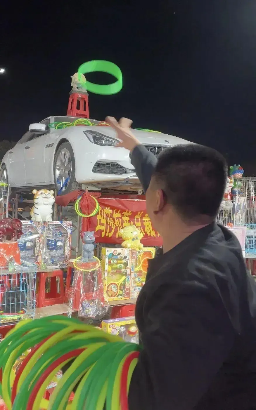此外,有摊主透露,春节期间套圈摊位日均收入可达五六千元,尤其是初一到初六,客流量大,微信收款每日超200笔。业内人士表示,此类豪车奖品去年已出现,虽为噱头,但真实有效,套中即可开走。“像这个摊主拿二手玛莎拉蒂来当奖品摆摊套圈的,他肯定不会赔本的。”